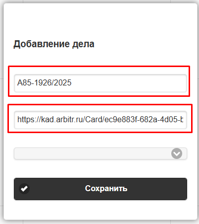 Откройте нужное дело на сайте арбитражного суда суда в системе КАД АРБИТР. Скопируйте в эти поля ссылку на дело и номер дела.